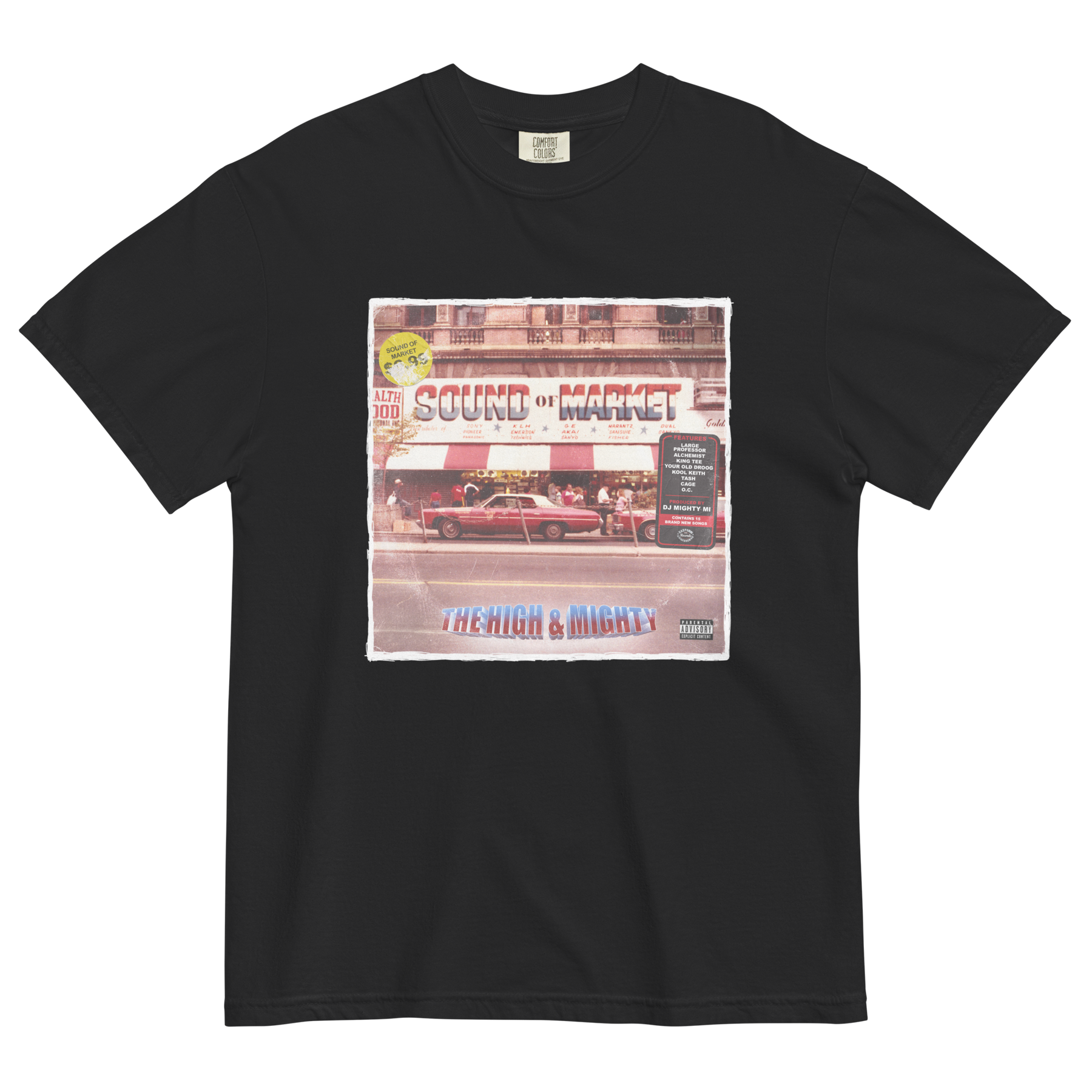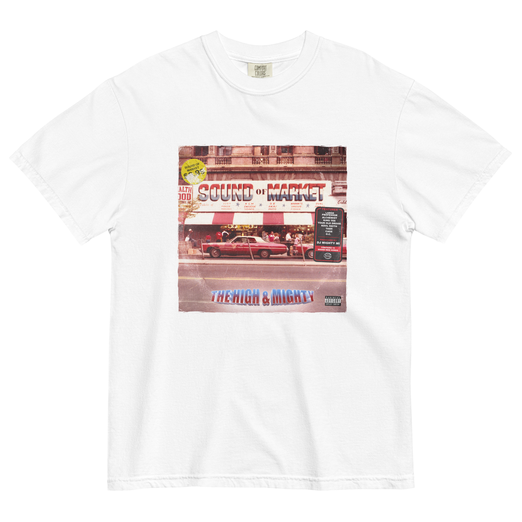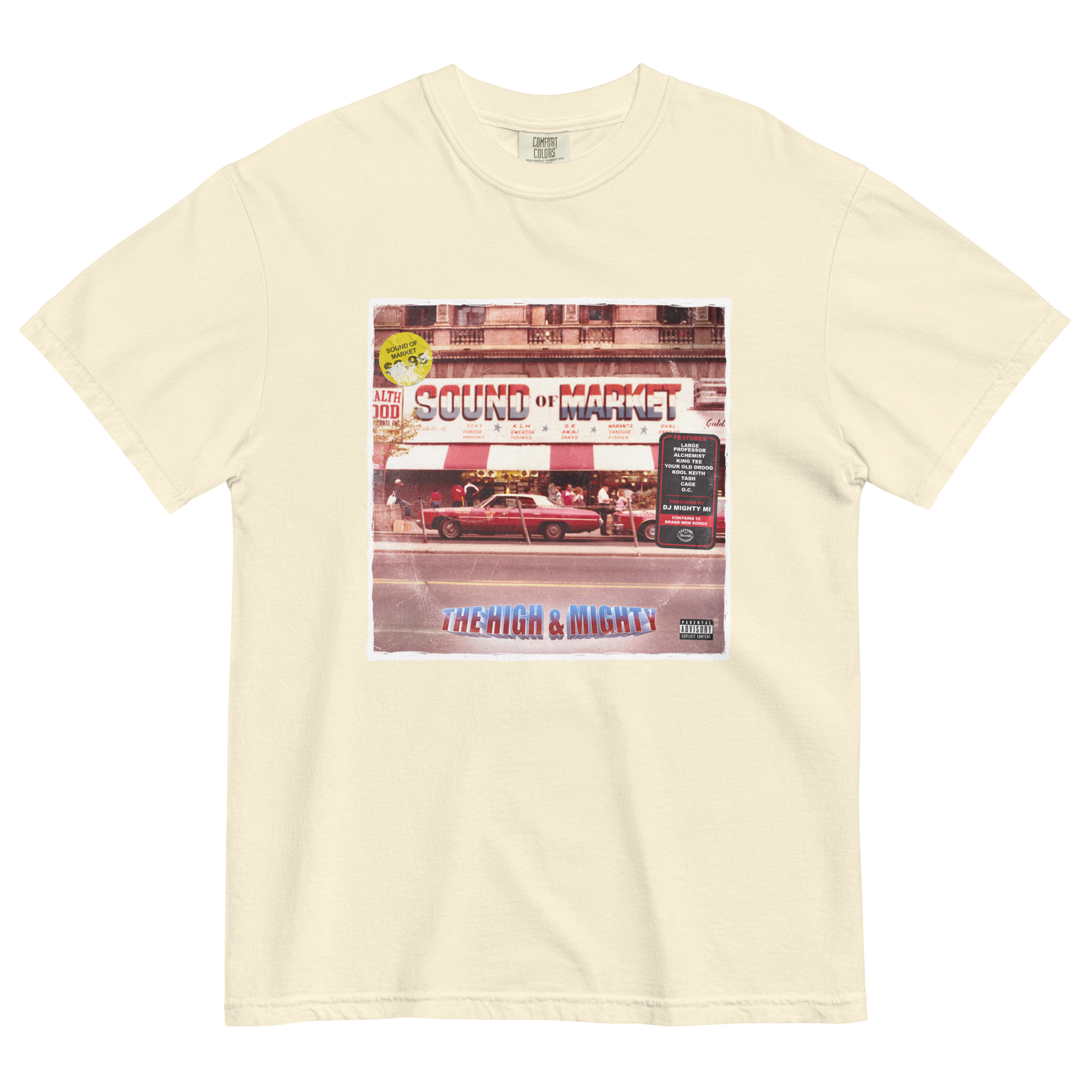 Classic tee featuring The High & Mighty's "Sound of Market" album artwork. Available in black, white, and ivory.