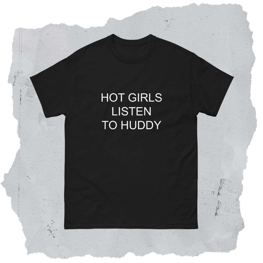 Exclusive "Hot Girls Listen To Huddy" design on a black tee.